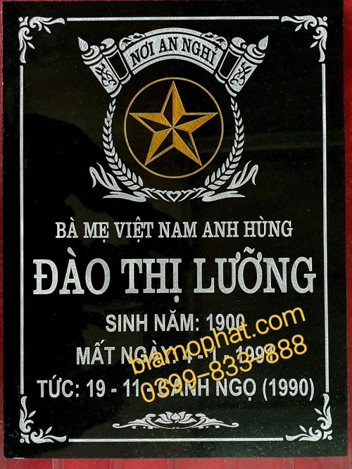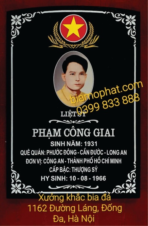 Khắc Bia Mộ Liệt Sĩ, Chữ và hoa văn được chạm khắc sâu và cực nét. Phôi đá tự nhiên, nhập khẩu có màu đen nguyên thủy không phai màu theo thời gian. Ảnh Men sứ công nghệ in phin âm bản, nung ở nhiệt độ 1200 độ c, cho ảnh trung thực, bền vĩnh cửu. Sơn bê tông đặc chủng 2k bền màu, không bong chóc.